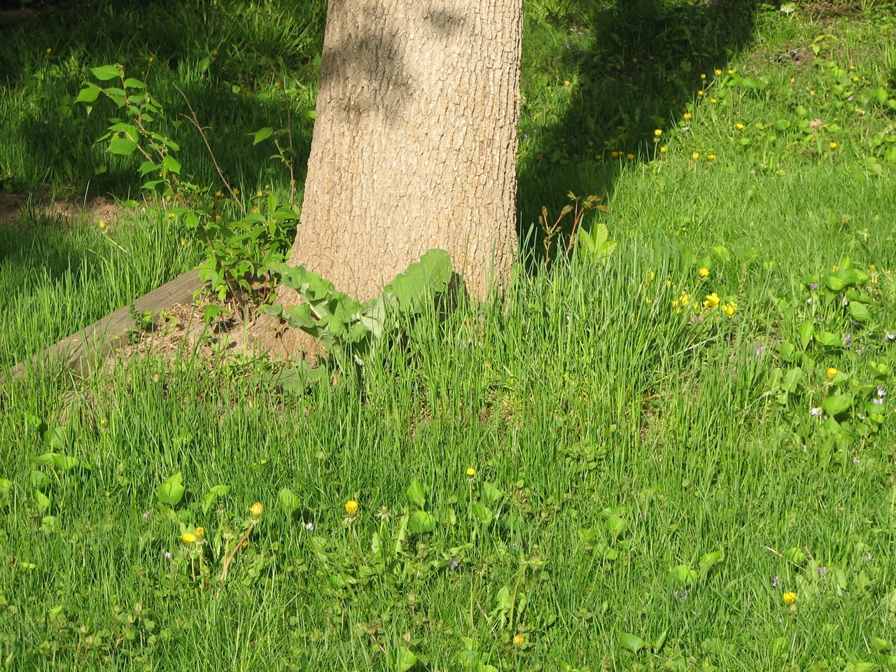 download file That big leafy thing is, I think, a cousin to burdock, which I pulled up last year. The grass you can see at the front right of that tree is grass I have NO IDEA where it came from because it's huge, tall, and ARROW STRAIGHT. There's SUPPOSED to be some flowers growing around this thing. There's a couple, over in the back right corner. (1) those were annuals, I thought. 2) They were PURPLE in 2007) |