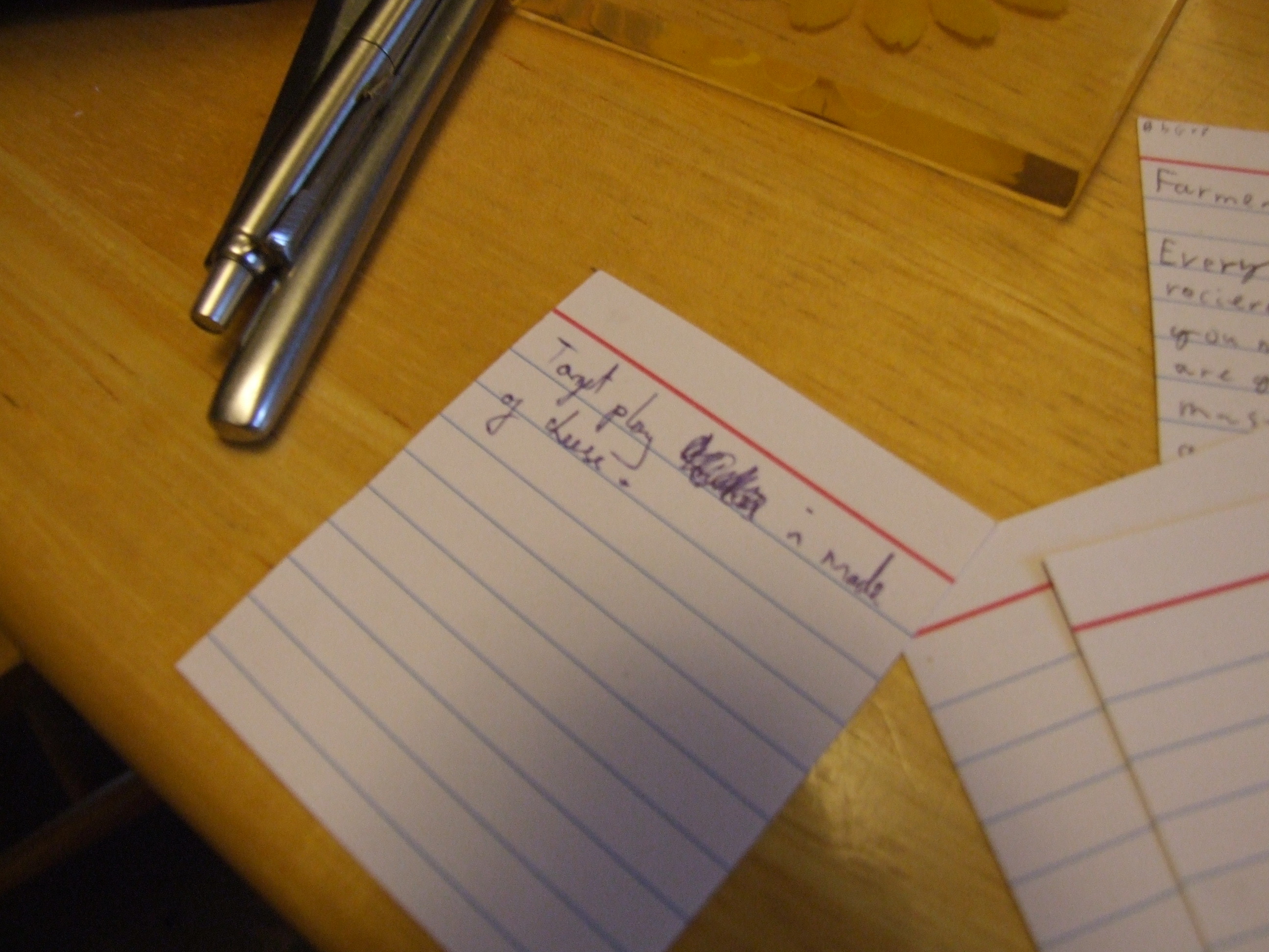 This was voted best card by most people, purely due to Stu's incompetence at writing. As far as we can make out, this one says "Target play in made of cheese." Truly, a baffling scenario...