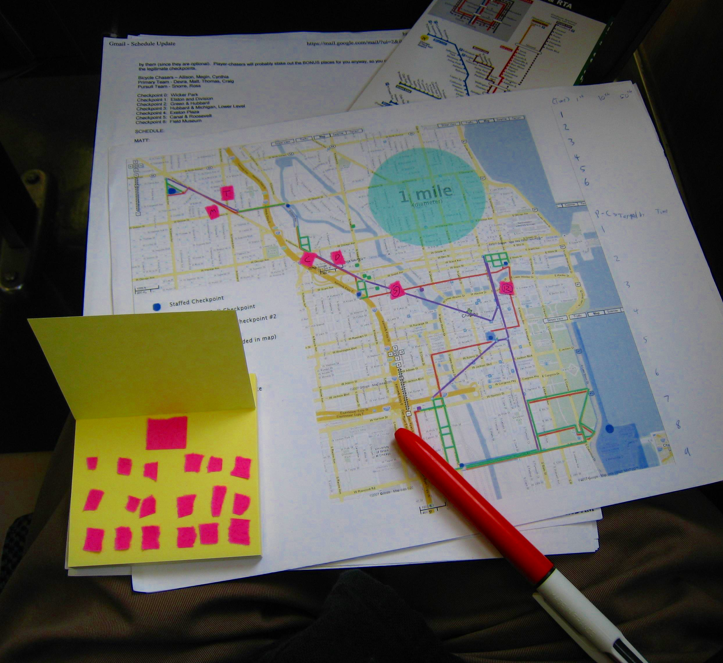 A Chicago map, a journey map, several sheets of instructions, and a number of sticky notes to attach as players and chasers moved through the city.