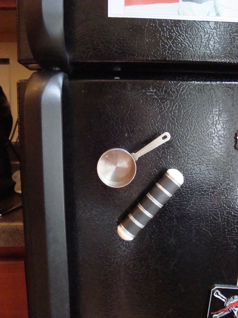 Lacking an electronic metal detector, I fell back on...SCIENCE! Behold, the biggest magnet on my fridge!