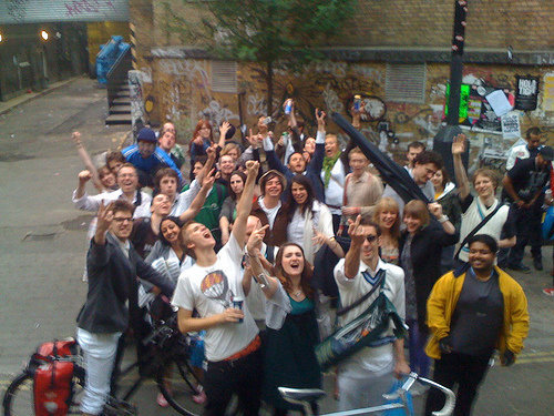 download file We'd been playing for so long, it got light again (I was batting just as the sun came up, I'd swear blind). Then someone clever (who took this photo), remembered the tube would be starting up again shortly. He got up on a window ledge, and suggested we ought to have the first circle line party of the day, on the first train of the day. Brilliant idea (though we too slow, and only boarded around 5:45 (the second or third train). Then he cussed Bojo, which provoked the reaction you see. |