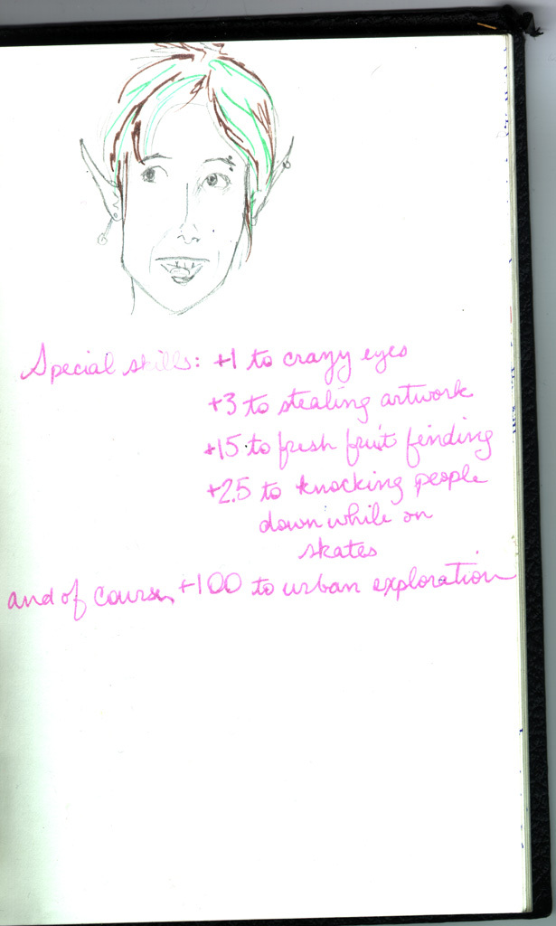 Special Skills: +1 to crazy eyes +3 to stealing artwork +15 to fresh fruit finding +2.5 to knocking people down while on skates and of course +100 to urban exploration
