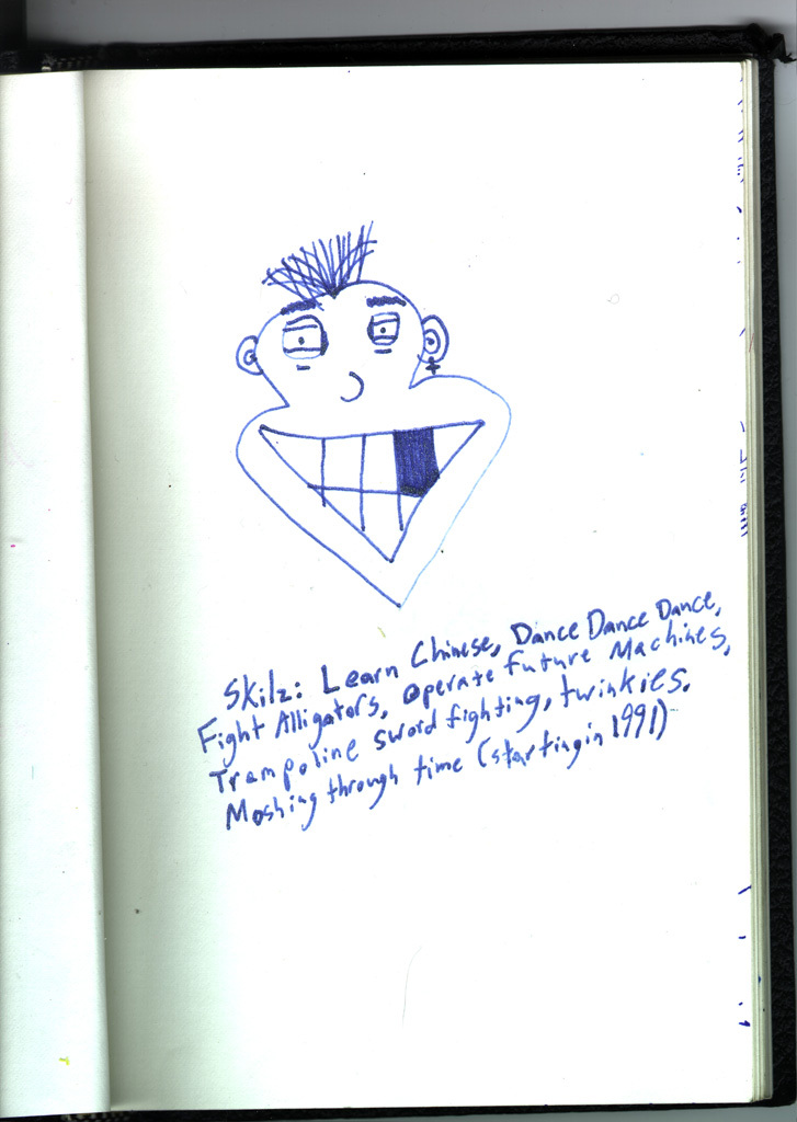 Skilz: Learn Chinese, Dance Dance Dance, Fight Ailligators, Operate future Machines, Trampoline sword fighting, twinkies, Moshing through time (starting in 1991)