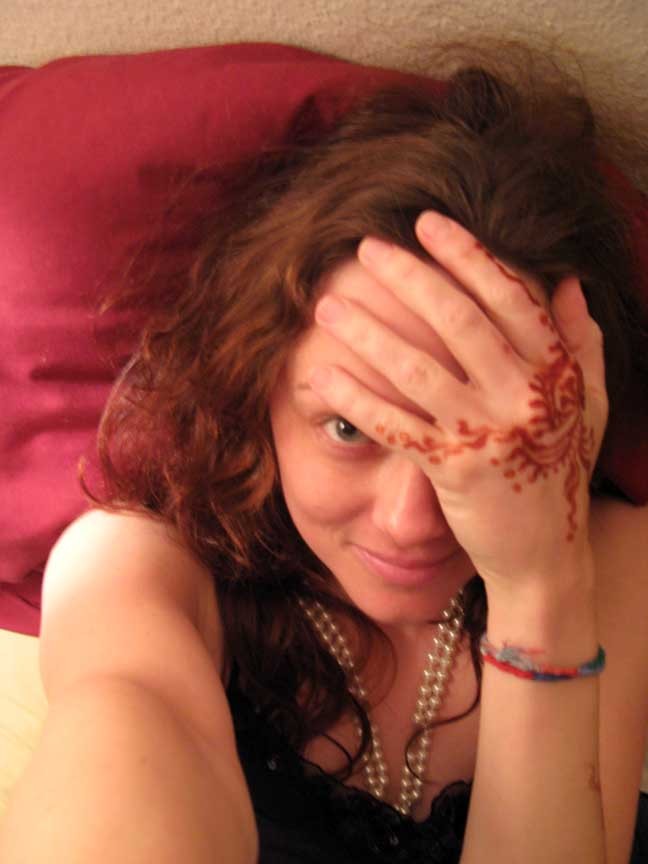Thread, tasking pearls, henna, right eye, smile... Check.