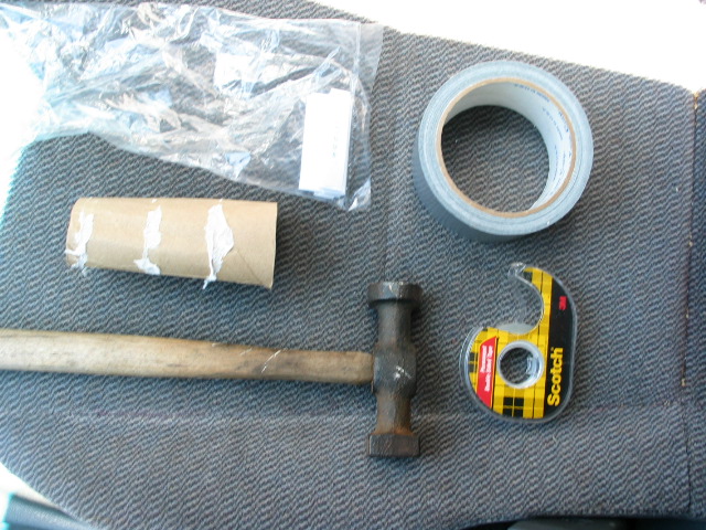 weapons of fortune: duck tape, 100 or so paper fortunes, small wood handled hammer, empty toilet paper roll, double stick scotch tape