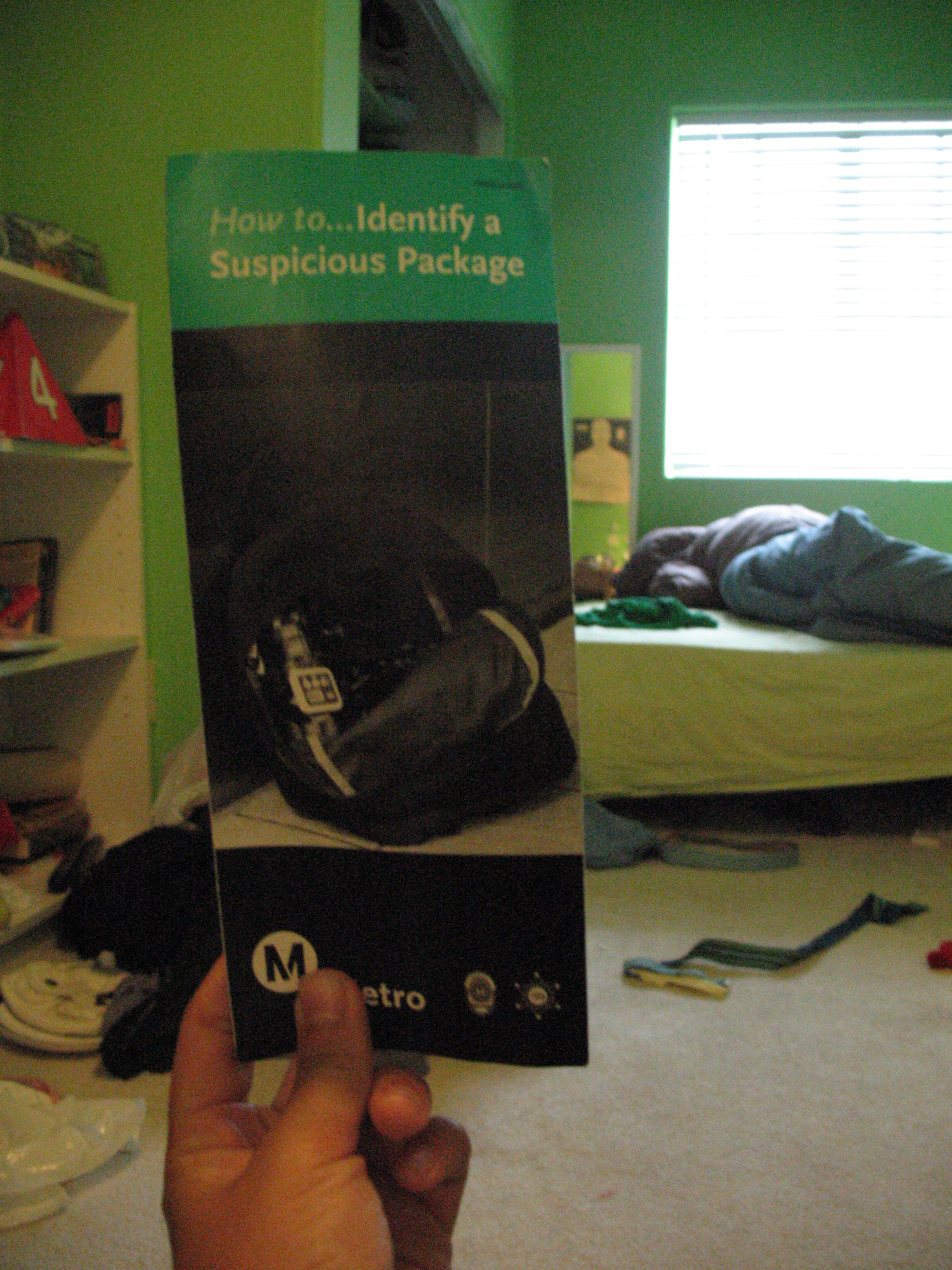 Badly lit, I know, but the text reads "How to Identify a Suspicious Package". Apparently the people on board either didn't read this brochure or Cheerio and I didn't meet its criteria for suspicious.