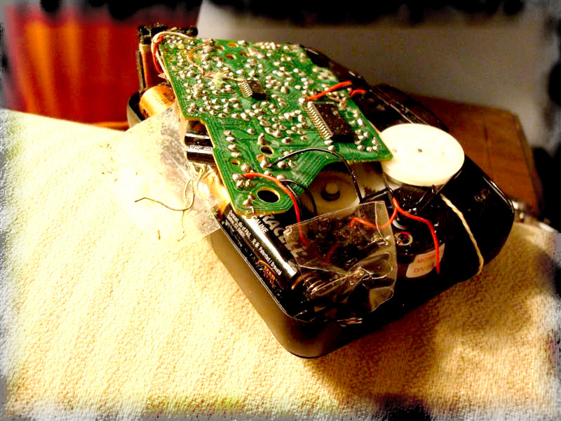 download file This walkman had to be pulled open to work, and while we were tinkering with it we added a rubber band that rubbed against the main wheel, which created a distorted sound by alternately slowing down and speeding up the tape. |