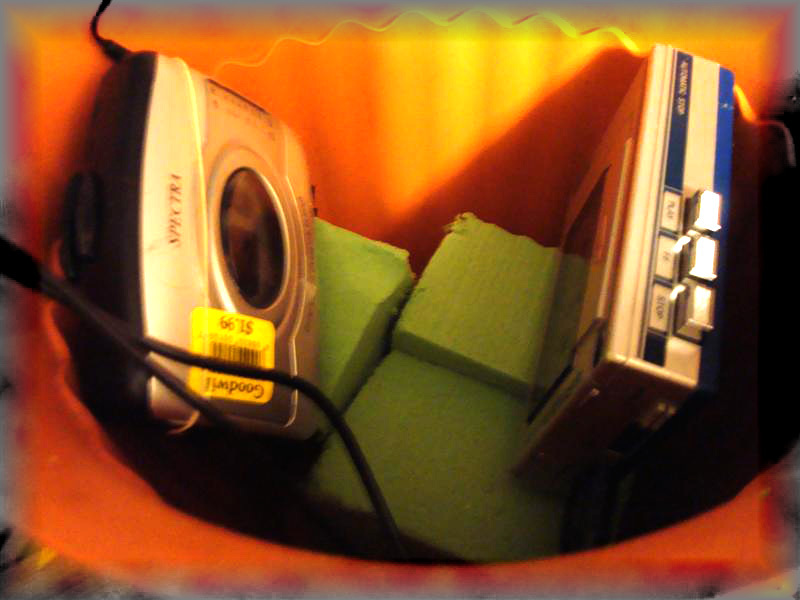 These are the two walkmen that we inserted into the pot. Later the moss was put over them to obscure them, but we left the tops visible so we could push the "play" button.