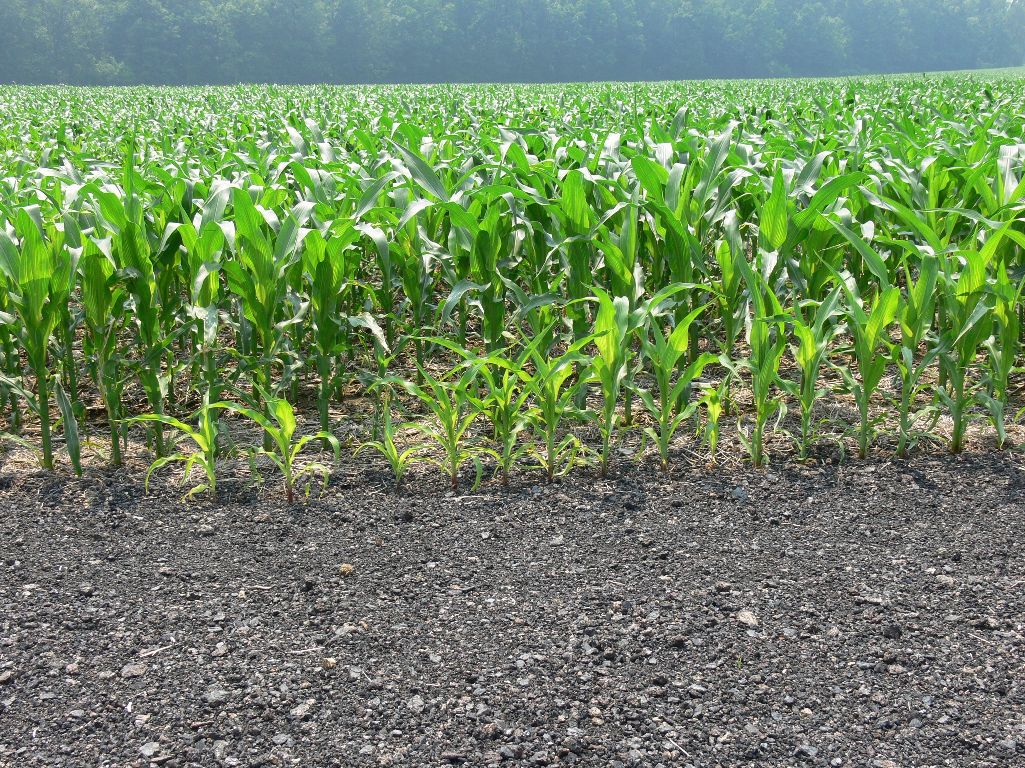 The more deeply its buried in the path, the more trouble the corn has growing. Here, a line of corn with each next stalk taller than the previous.