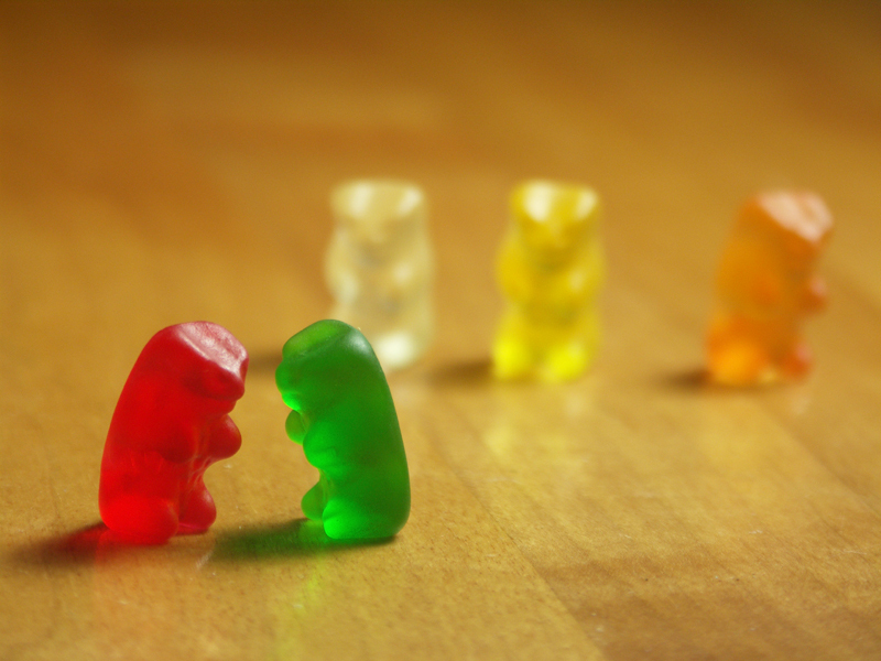The red and green gummies are plotting something devious for the first question. GOSSIP: The green gummy recently broke up with the orange gummy, and was still taking it pretty rough.