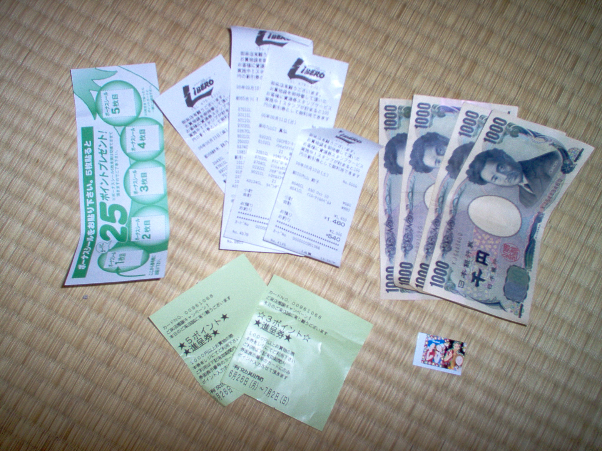 - 4recepts from the grocery store - 2 point coupon things from grocery store - 1 mystery thing also from grocery store - 4000yen ($34.50) - two sticker pictures, not cut