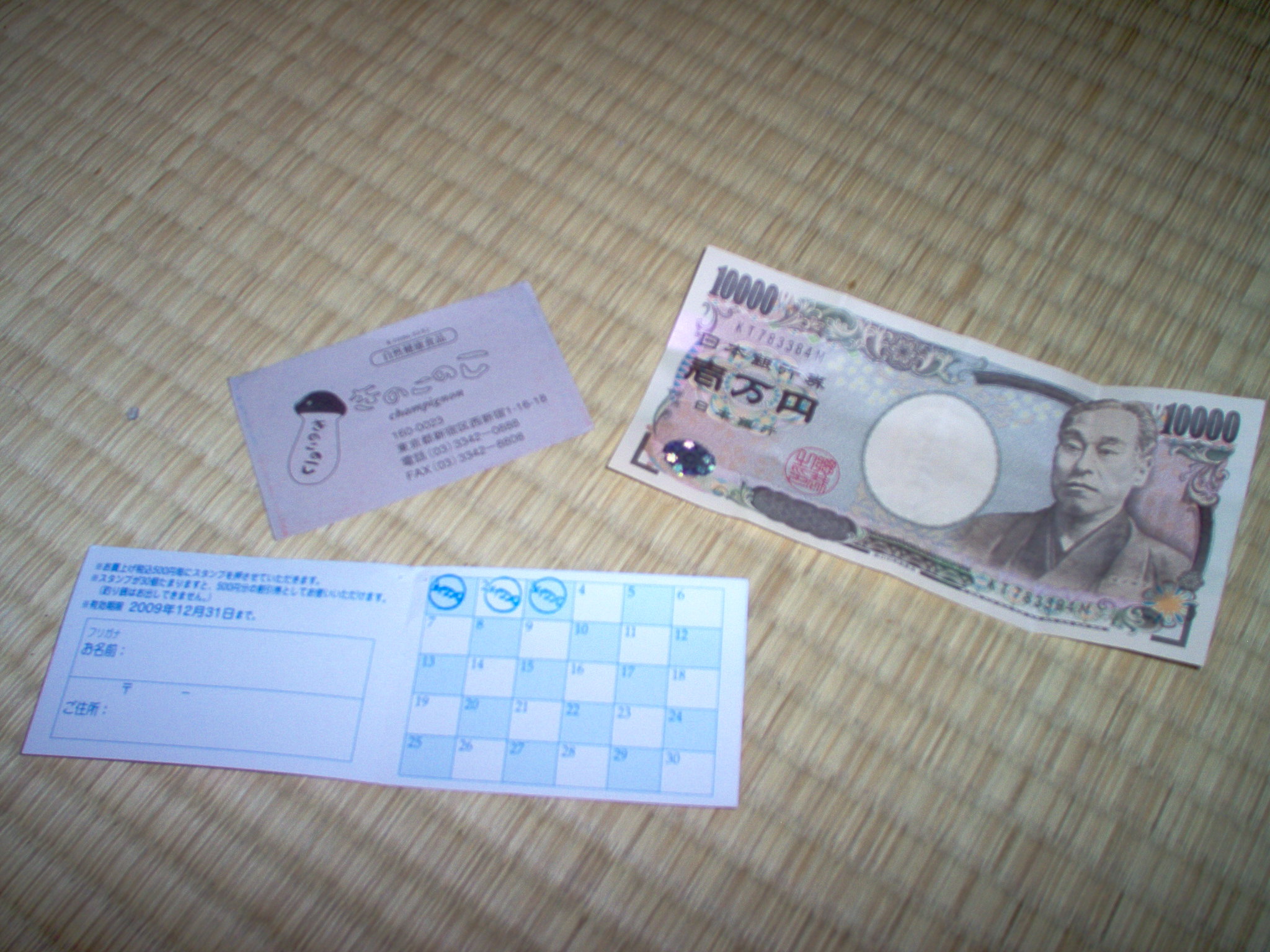 - buisness card from mushroom resturant in tokyo - another point card to the same buffette place - 10000yen in secret pocket ($86)