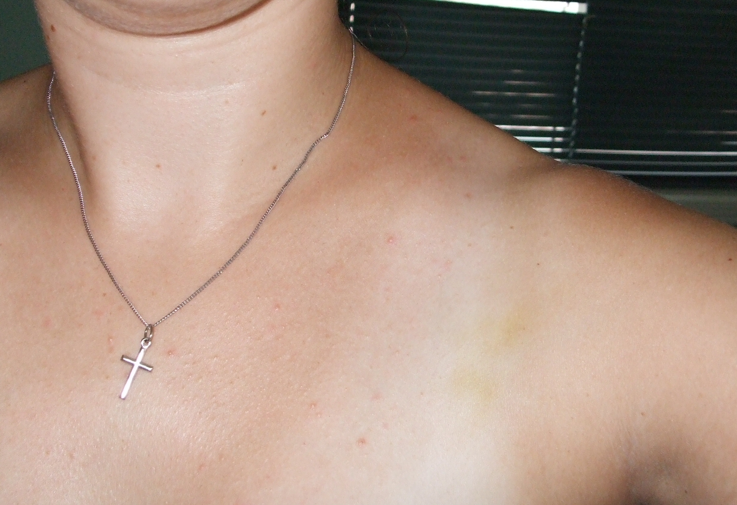 5 weeks after inital injury. Still a slight bit of bruising. You can see the bump that is my healing collarbone.
