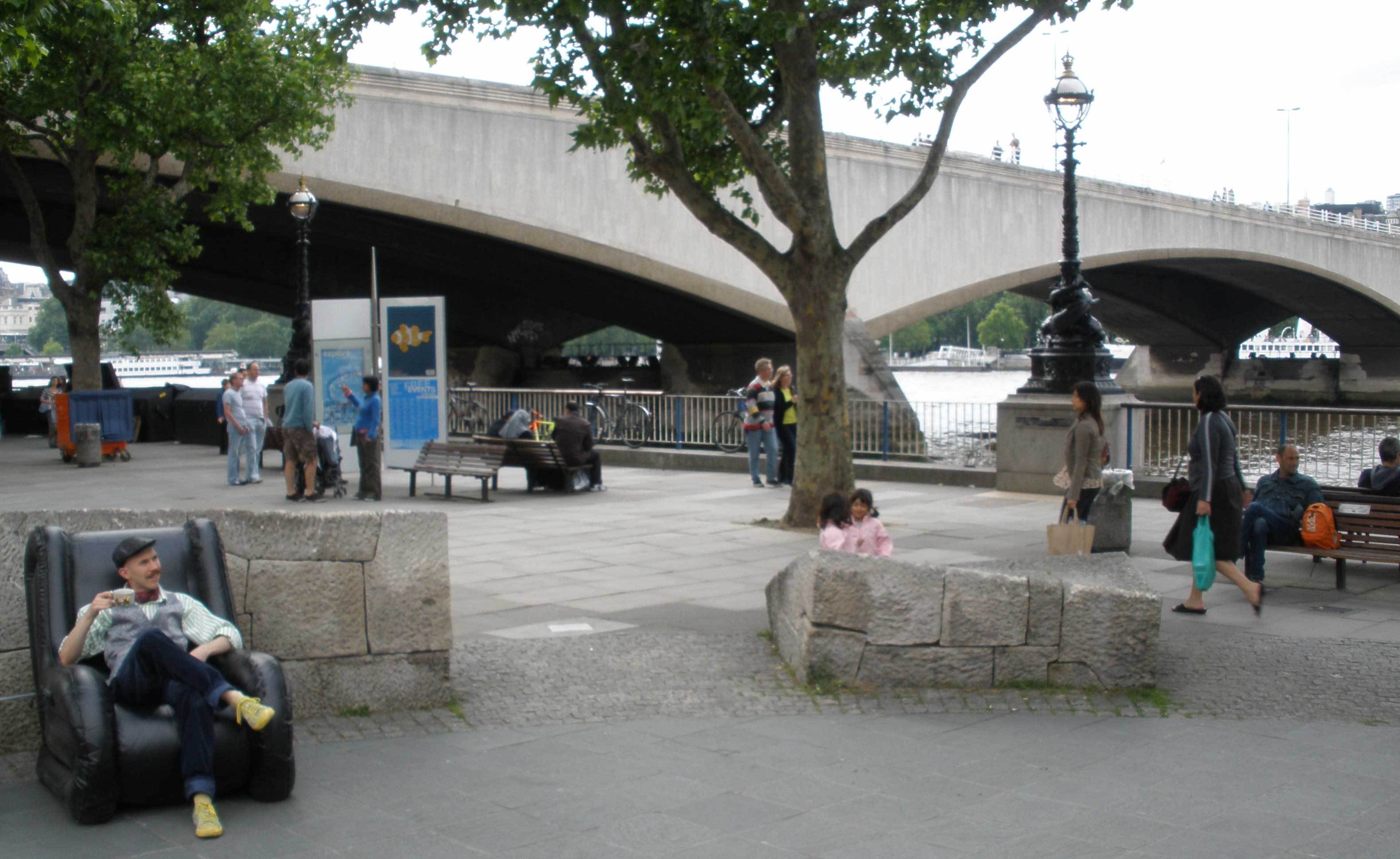 download file I rode to southbank on the bus with one of my flatmates, bot of us heavily laden. The spot was tried and tested, but full of cyclists. I decided to inflate the chair and figure it out from there. Just inside the BFI bar I asked a security guard if I could inflate it there (No), and whether there were any plugs elsewhere in the building (By the restaurant at the far end). As soon as I got there, I started up. The pump wasn't as loud as expected, but still noisy. Halfway through, a man in plain clothes with an official-looking id on his belt approached with a questioning look. I explained that security by the far end had directed me here, and that I wouldn't be a moment. He walked away looking puzzled, and I stumbled out shortly after with a chair in my arms. Hooray for the 'pass the buck' instinct. By the time I got back to the circle the cyclists were gone, so the two of us installed ourselves inside. Straight away I felt comfortable, as it had actually become my living room. |
