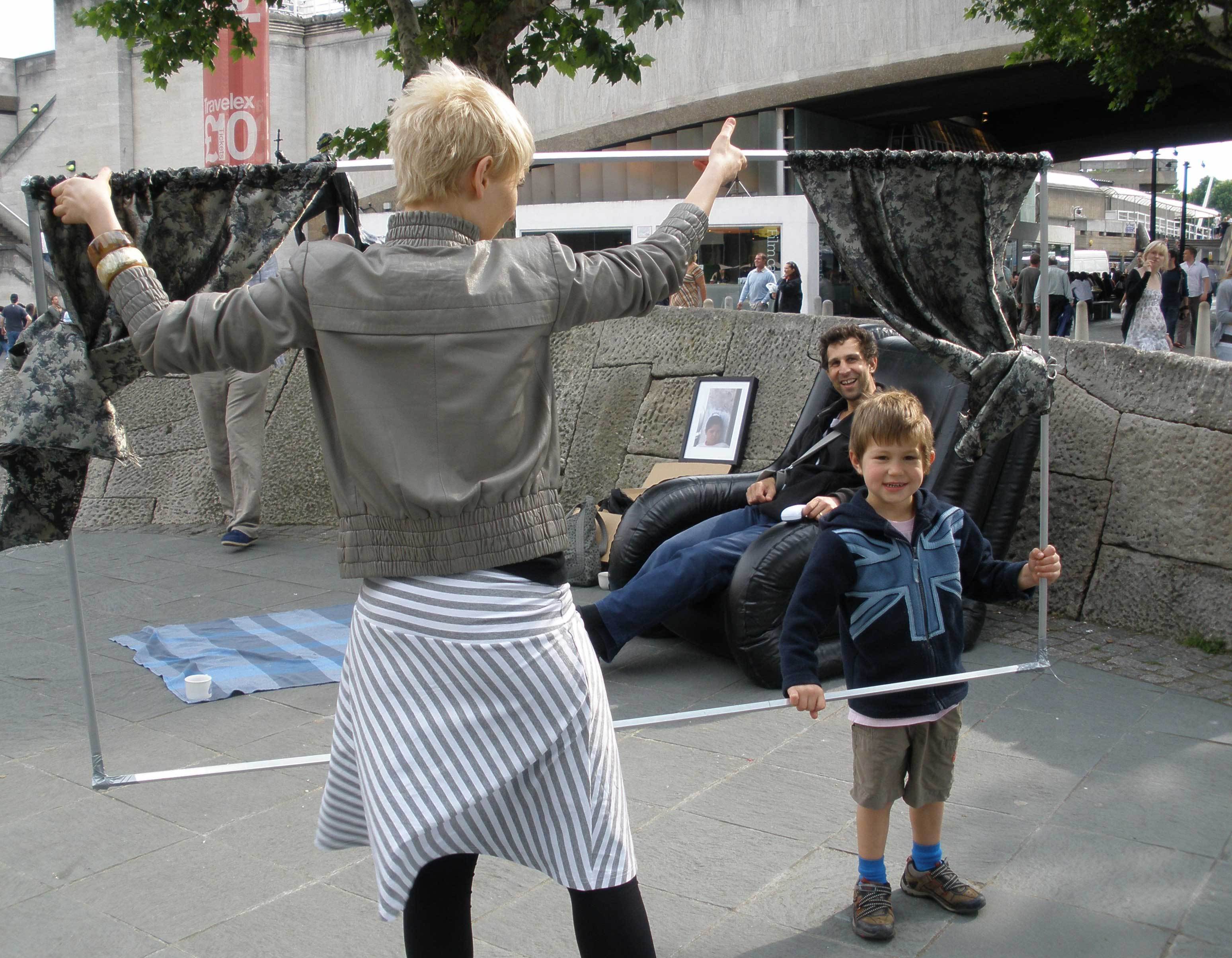 download file No sooner was the window fully assembled than we had our first guests/models. The fellow with the broken arm who took the chair when i offered it was very skeptical at first. His son was quite pleased to run around and play with anything/anyone. His wife stood just outside the stone circle the whole time. The man, it turns out, used to be a busker, so understood quite quickly the dynamic between the passer-by and someone staking a claim to public space and doing something a little unexpected with it. He appreciated that I was trying to avoid being insular about the whole thing, liked how the window device could act as both a way into the situation and barrier to allow people to separate themselves off if they so chose. We chatted for a good ten minutes, but then the family beckoned, they all moved along. |