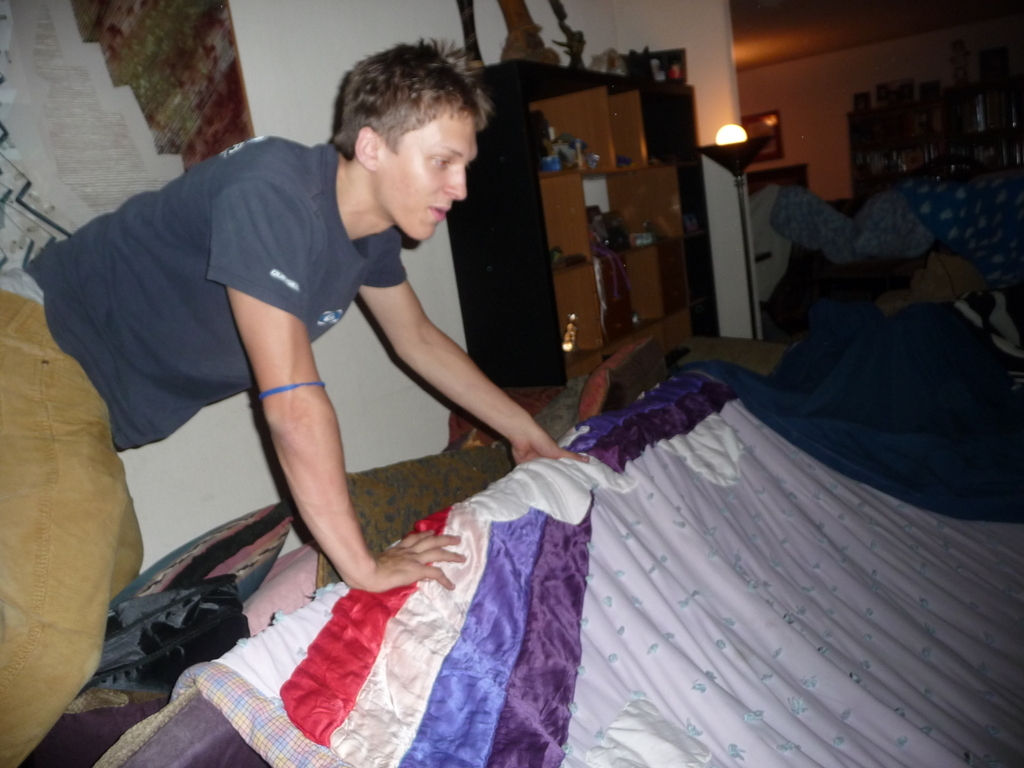 We made the walls by arranging a couch, a big comfy chair, an upended ottoman, and an upended coffee table in a rough circle around the room. Blankets were anchored on the couch using the couch's many cushions.