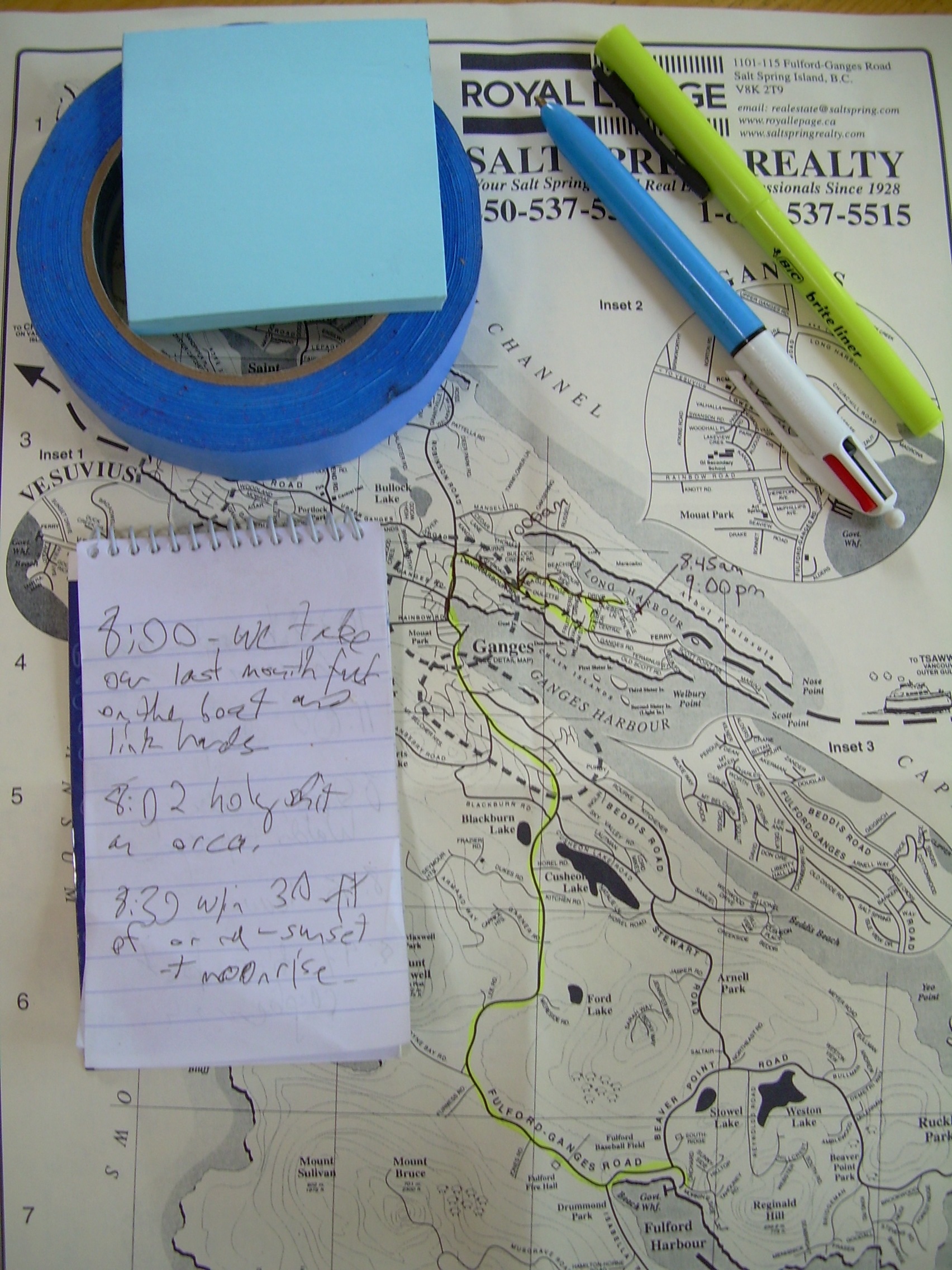 Pad of paper for notes, pens, maps, sticky-notes. Why the blue tape? Why indeed.
