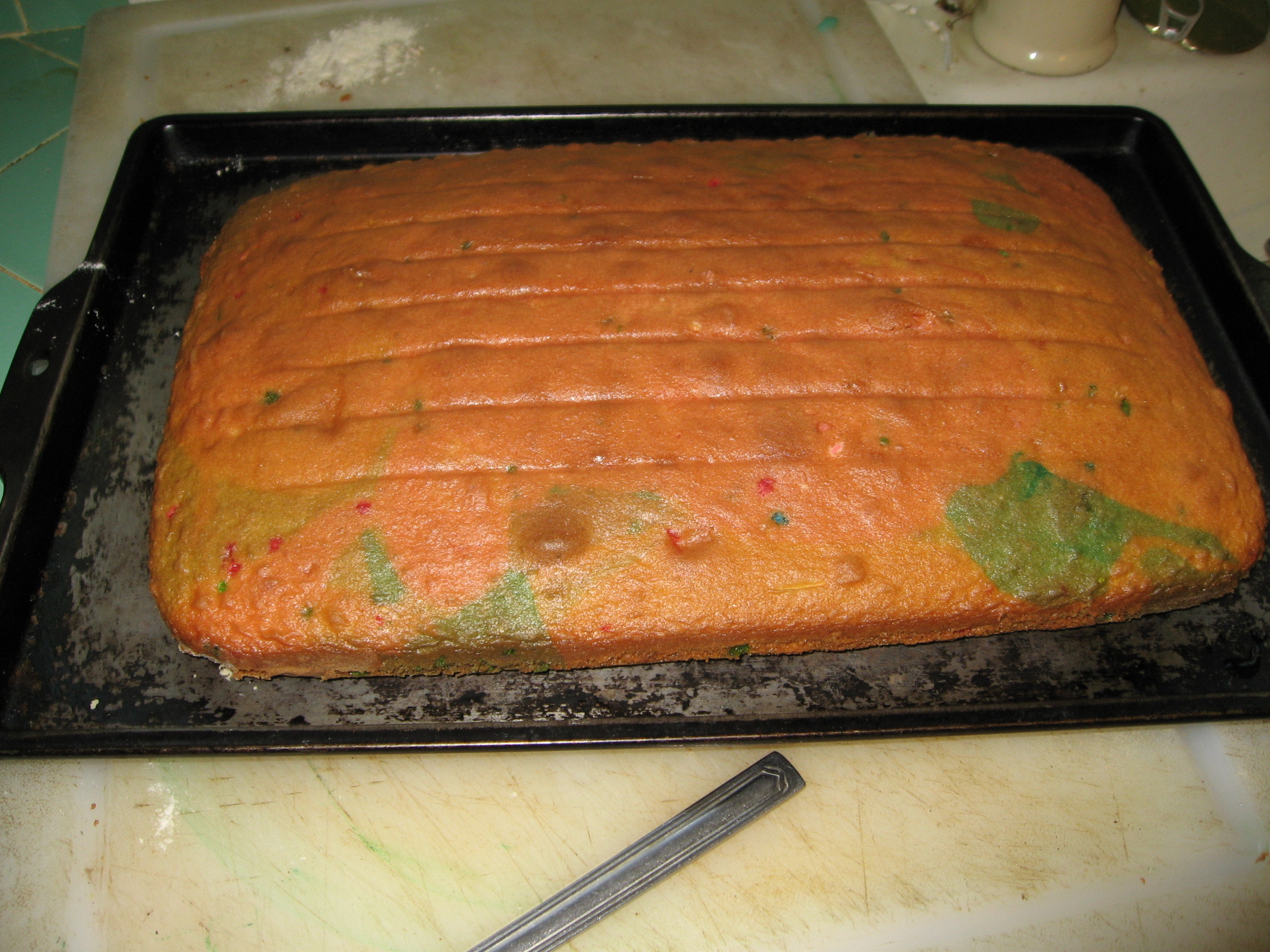 The cake was then placed on a separate cooling pan to await frosting. Notice the subtle blues and greens that mottle its top.