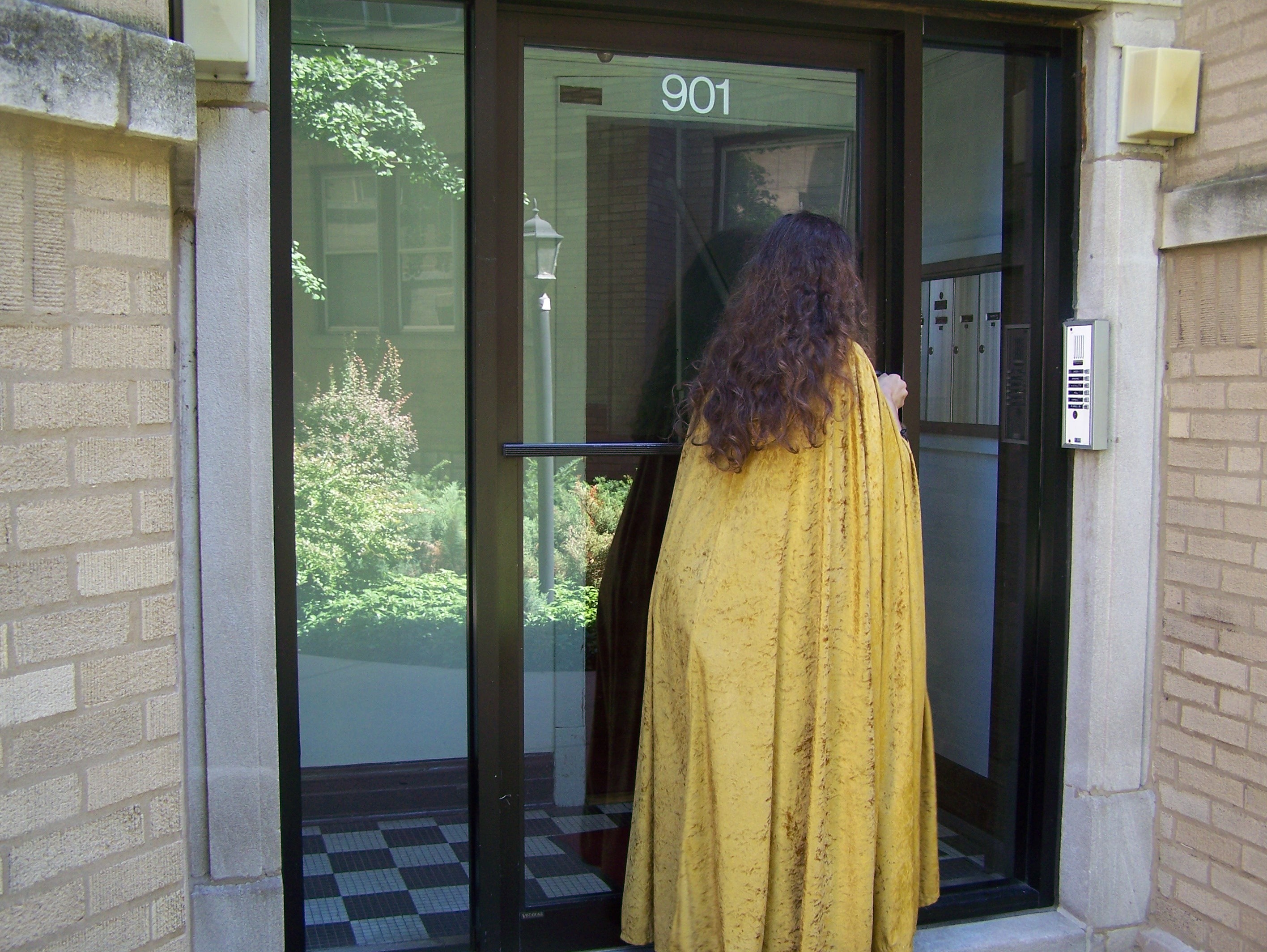 Sneaking into the downstairs door.