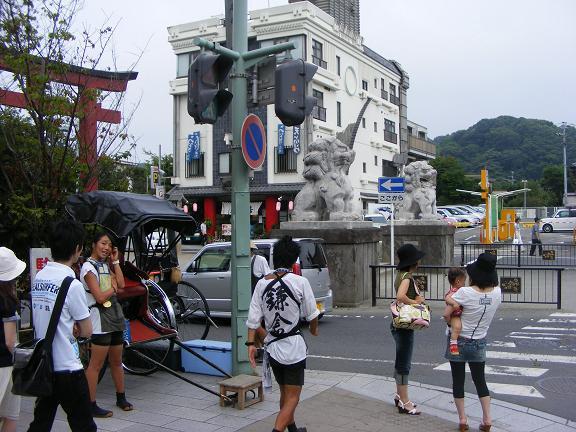 Spotting another gate, I head towards it. There are a nice pair of temple-dogs across the street too. Some riksha drivers are touting for business...