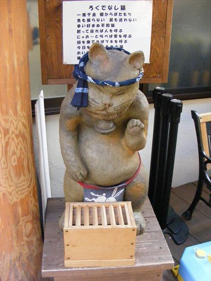 download file Cool, a money beckoning cat. And he has a money box. Add money, take photo... Hmmm... I wonder... WELL! It turns out that he IS an anatomically correct money beckoning cat under that loincloth... well, for certain values of "correct" anyway, cats aren't usually that proud. What's he beckoning me into anyway... Oh, I see, A CAKE SHOP! |