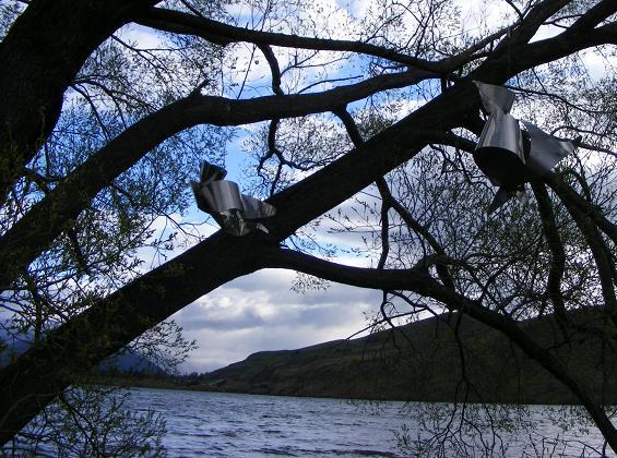 Shiny hanging sculptures. It was REMARKABLY difficult trying to climb the diagonal branch. Sveral attempts and I never got close. FAIL!!!