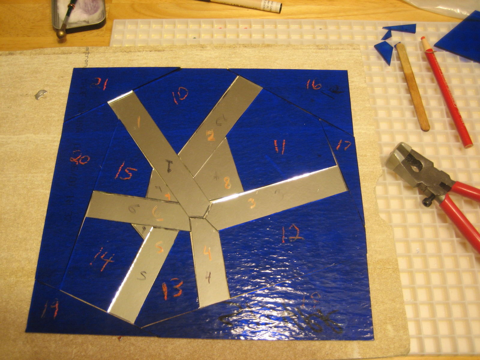 I used mirrored glass for the parts of the sign that represent streets, and a wavy textured blue glass for the background.