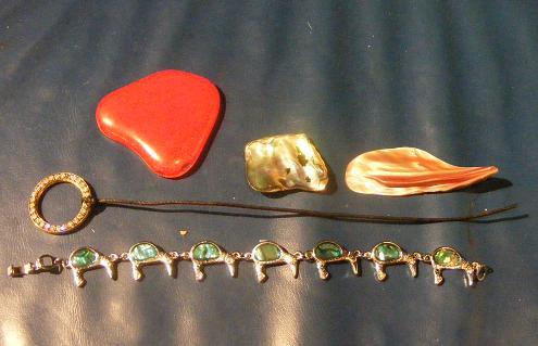 download file Some of the items I chose to hide. A piece of paua shell, a piece of pink mussel shell, a blob of melted art glass, a pauashell kiwi braclet, and the bling-encrusted extra face of a watch missing one shiny stone. |