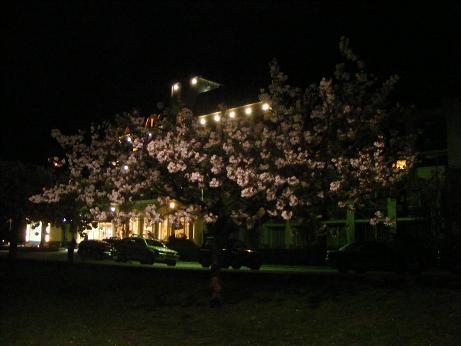 He's at the far right end of the tree. Inone of the three blossoms at the bottom.