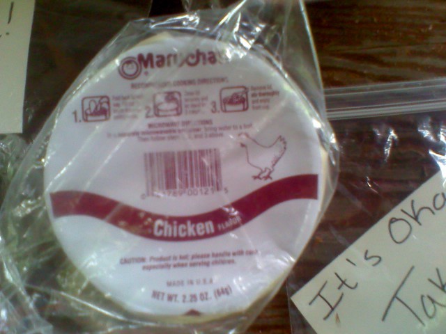 The ramen being prepared, it didn't really fit in a bag very well, but we taped the bottom (and wrapped the note around the outside)