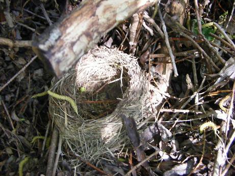 download file An empty nest, from the last season (you can tell by the little green shoot in the base of it). A very challenging climb to get to this one, and I couldn't see in it by eye, so the camera (at the far end of my arm) did my looking for me. |