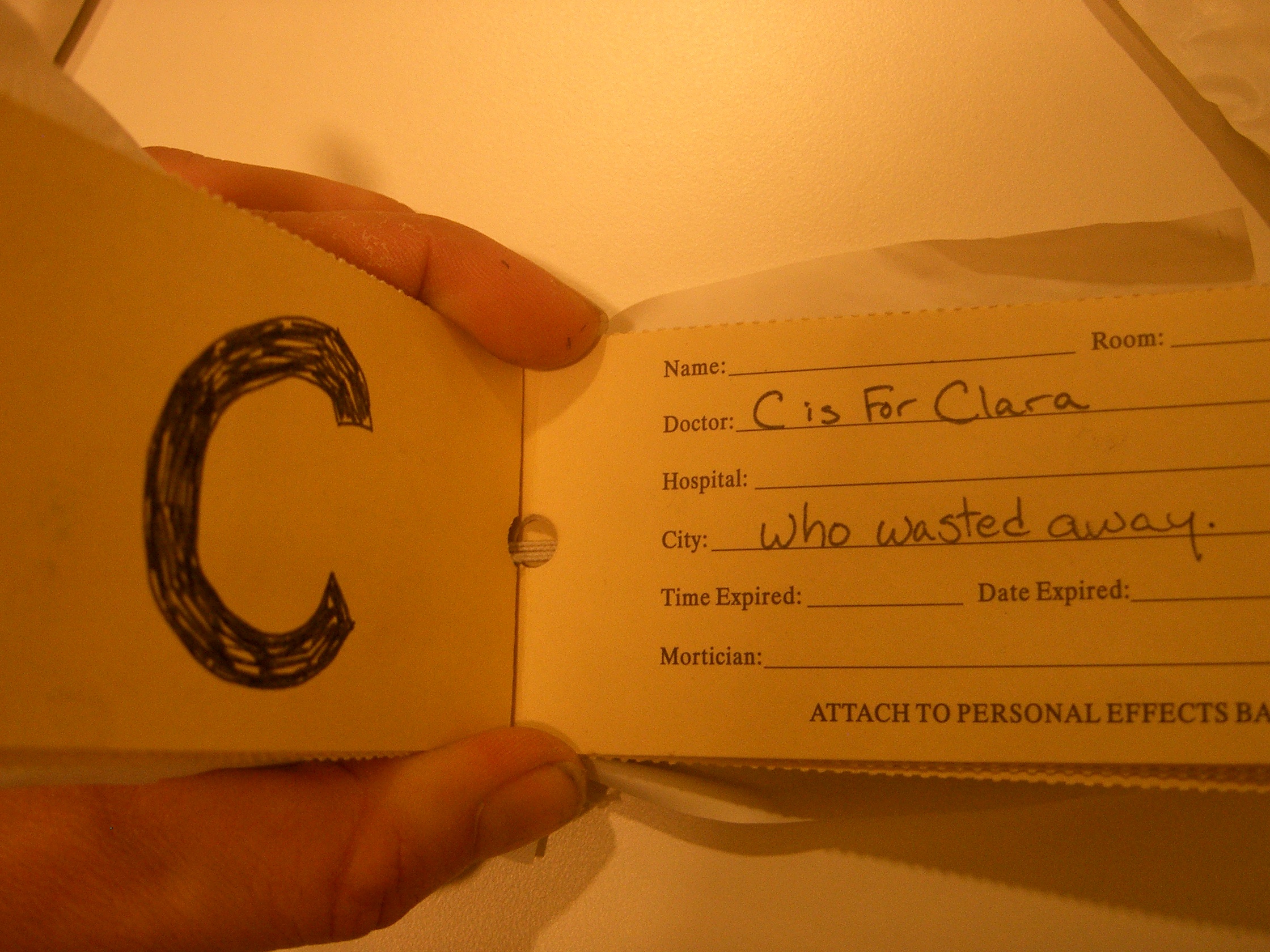 C is for Clara who wasted away.