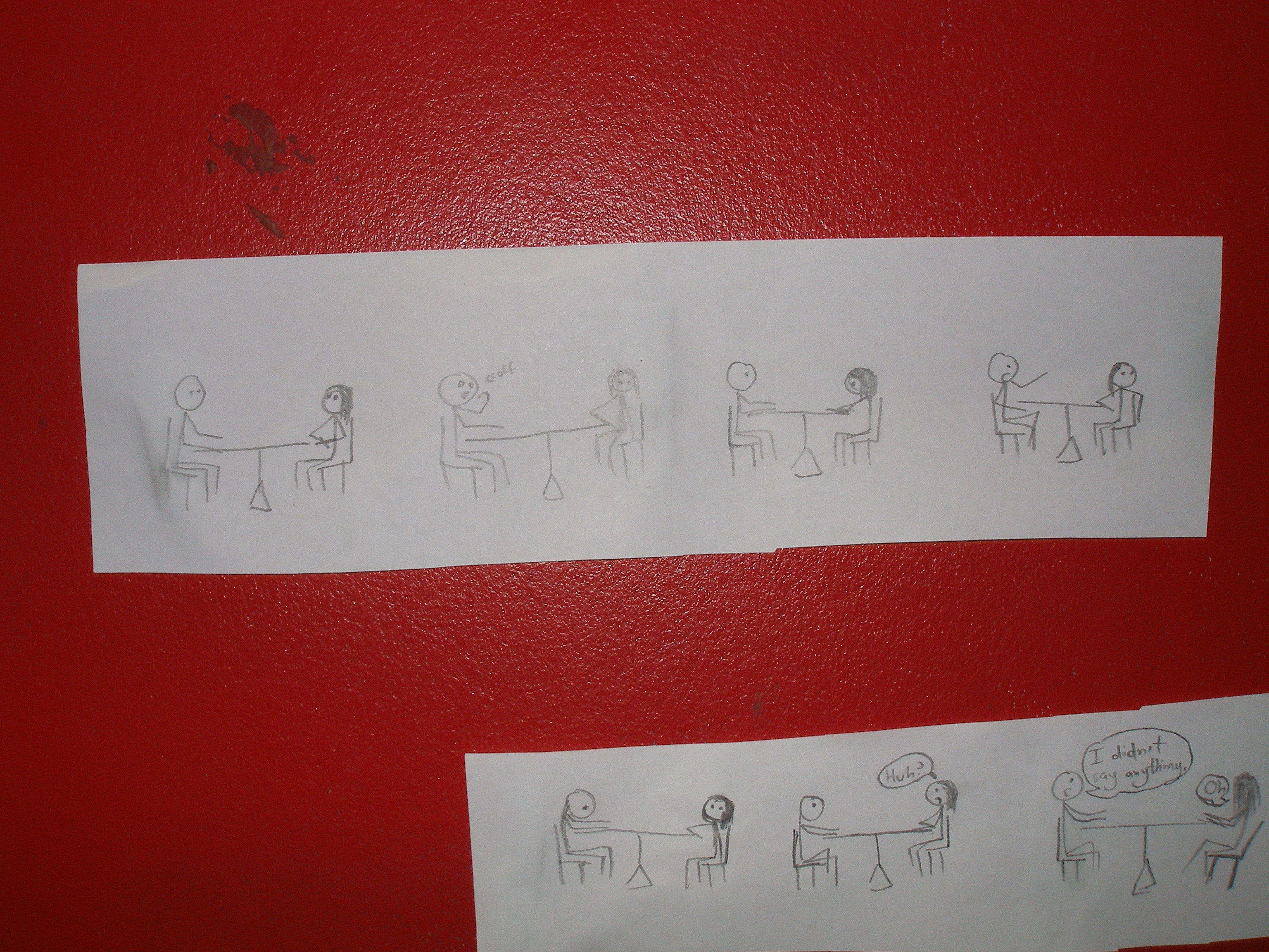 Characters spend many panels sitting awkwardly at table, not saying anything. Main character moves to speak, thinks better of it.