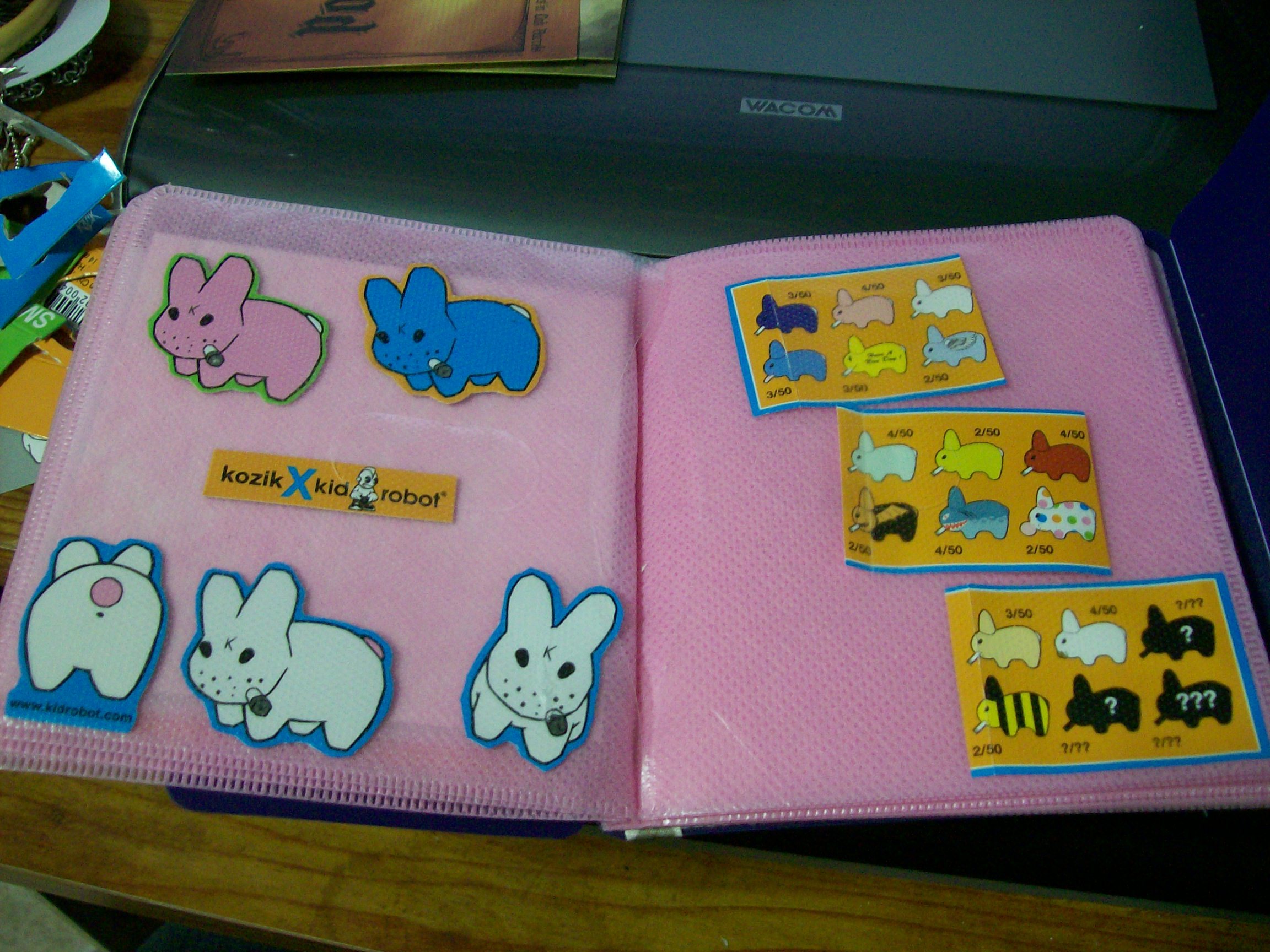 download file here are the Smorkin' Labbits from Kid Robot. On the left are all the cut-outs from the box. On the right are the different designs for the Labbits. As you can see they're not very secure in there right now. |