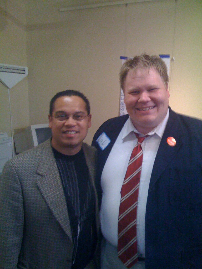 download file Rep. Keith Ellison (the only Muslim member of the US House, btw) was in the office, and I felt it was important to shake his hand and get my picture taken. I think Keith is the heir of the spirit of Paul Wellstone and he's such a positive guy. Also, smaller than I was expecting as you can see my hamfisted gigantism towering over him. . . |