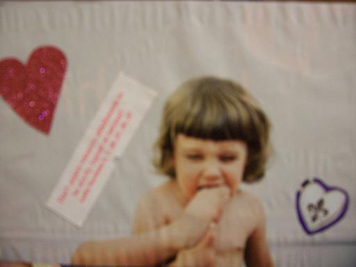 background of baby with foot in mouth, hand cut pink glitter heart sticker, fortune cookie fortune, heart with fleur cutout from magazine