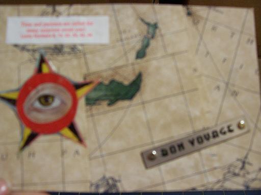 background of wallpaper samples, mystic eye cutout from magazine, fortune cookie fortune, plastic word tag, tiny brads