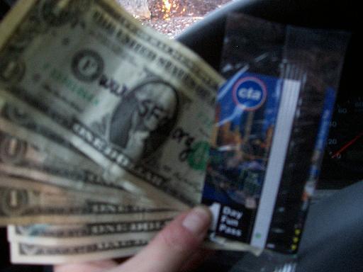 A one-dollar bill for each leg of the journey with the SF0 website written on them, and an all-day CTA bus pass