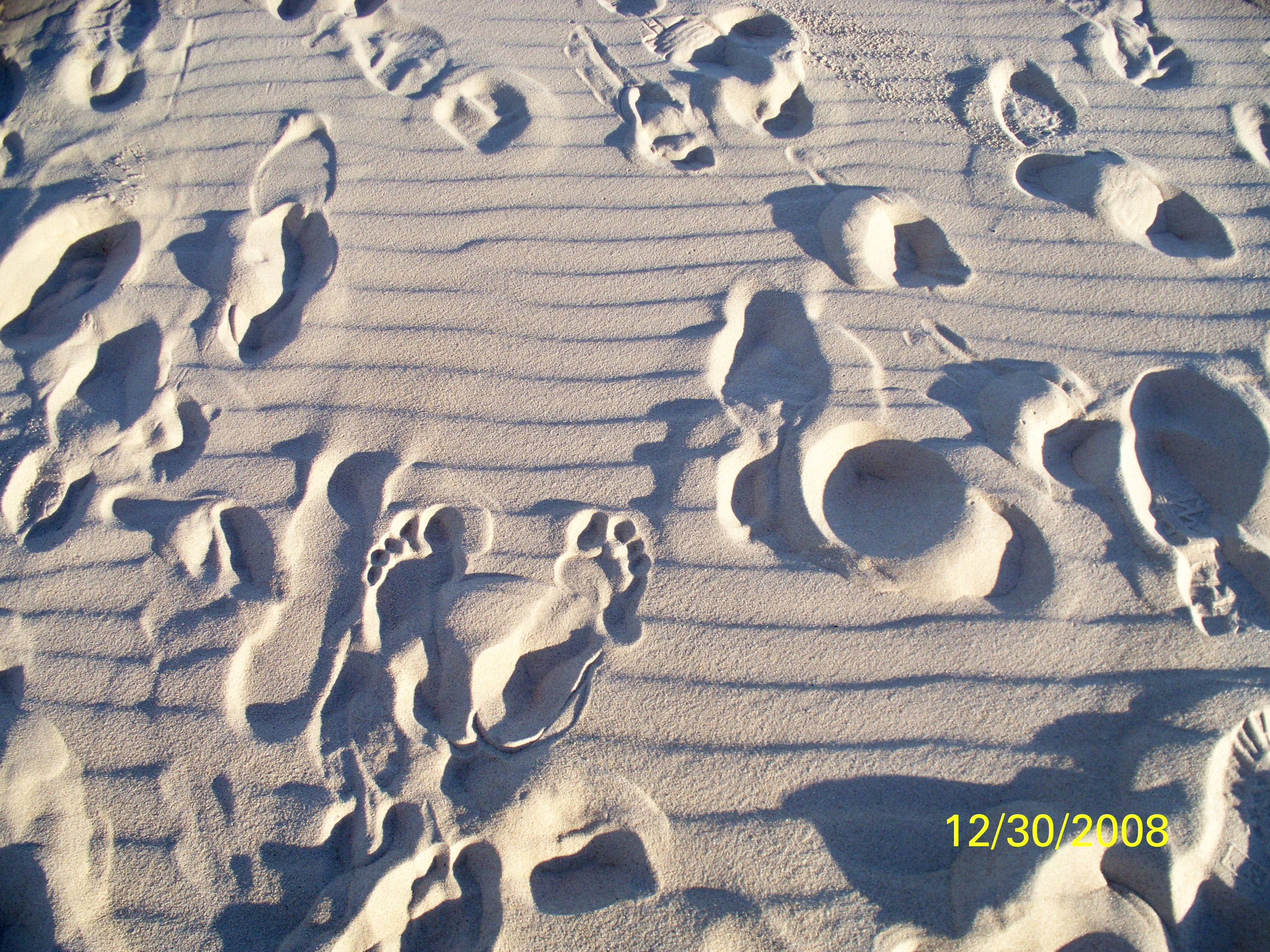 The natural movement of the sand punctuated with footprints. (Mine are the ones where you can see all the toes.)