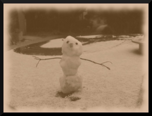 We will remember. Black Peppercorns for the eyes, naked mint twigs for the hands and a carved piece of carrot for the nose. That wonky smile was an accident caused by a bit of dirt in the snow.