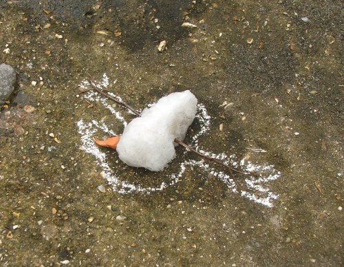 He was sat on a black glass table. When the snow melted from around him he must have slid off and landed face down.