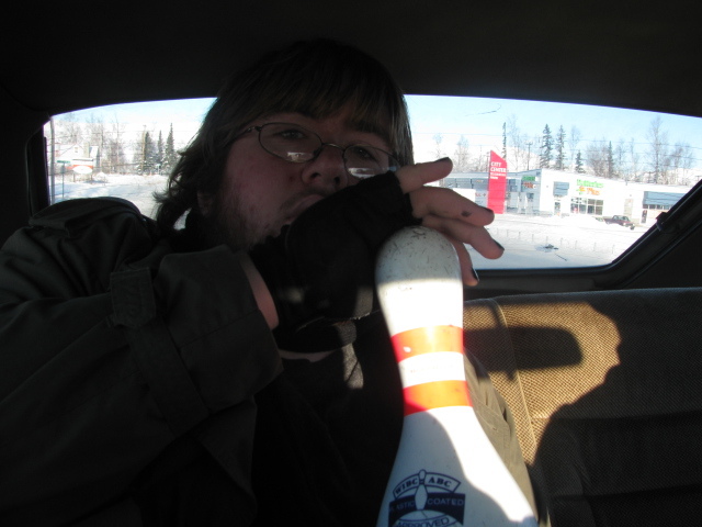 |   download file We went to the bank for money and the gas station to got energy drinks for us and the car. And then we stopped at a shady garage sale ebay store near city central and looked around. The only think we found that we liked was a bowling pin. We bought him for $2.20 and named him George. |