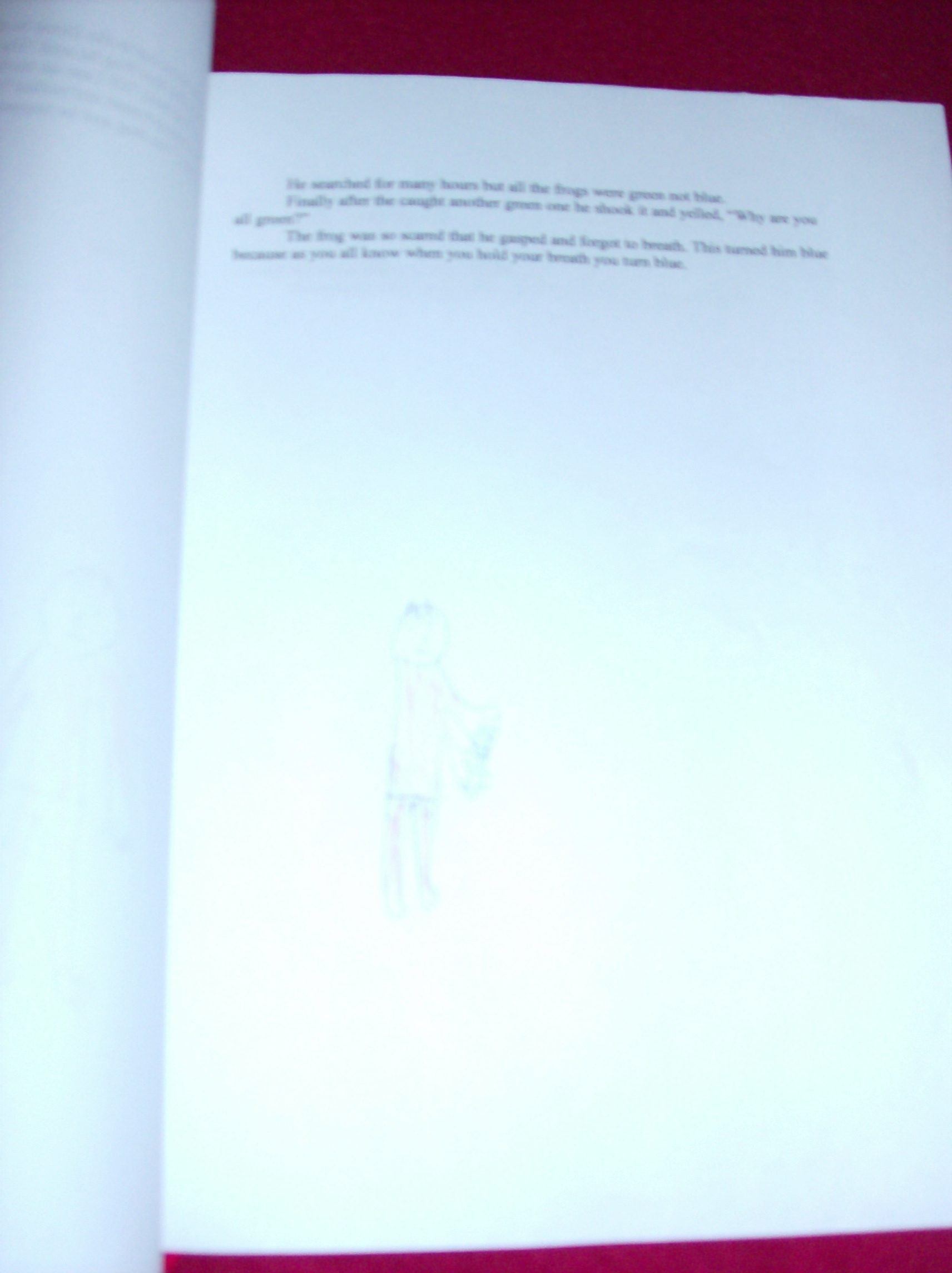 download file He searched for many hours but all the frogs were green not blue. Finally after the caught another green one he shook it and yelled, “Why are you all green?” The frog was so scared that he gasped and forgot to breath. This turned him blue because as you all know when you hold your breath you turn blue. |