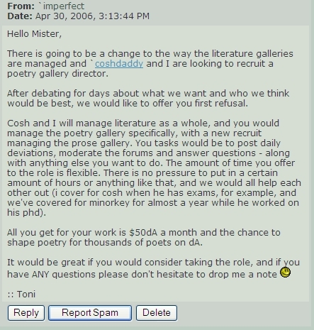 This is me almost becoming a Gallery Director and getting $50 DevBucks a month to spend on prints or something. The high point of my DevArt career! Deleted.