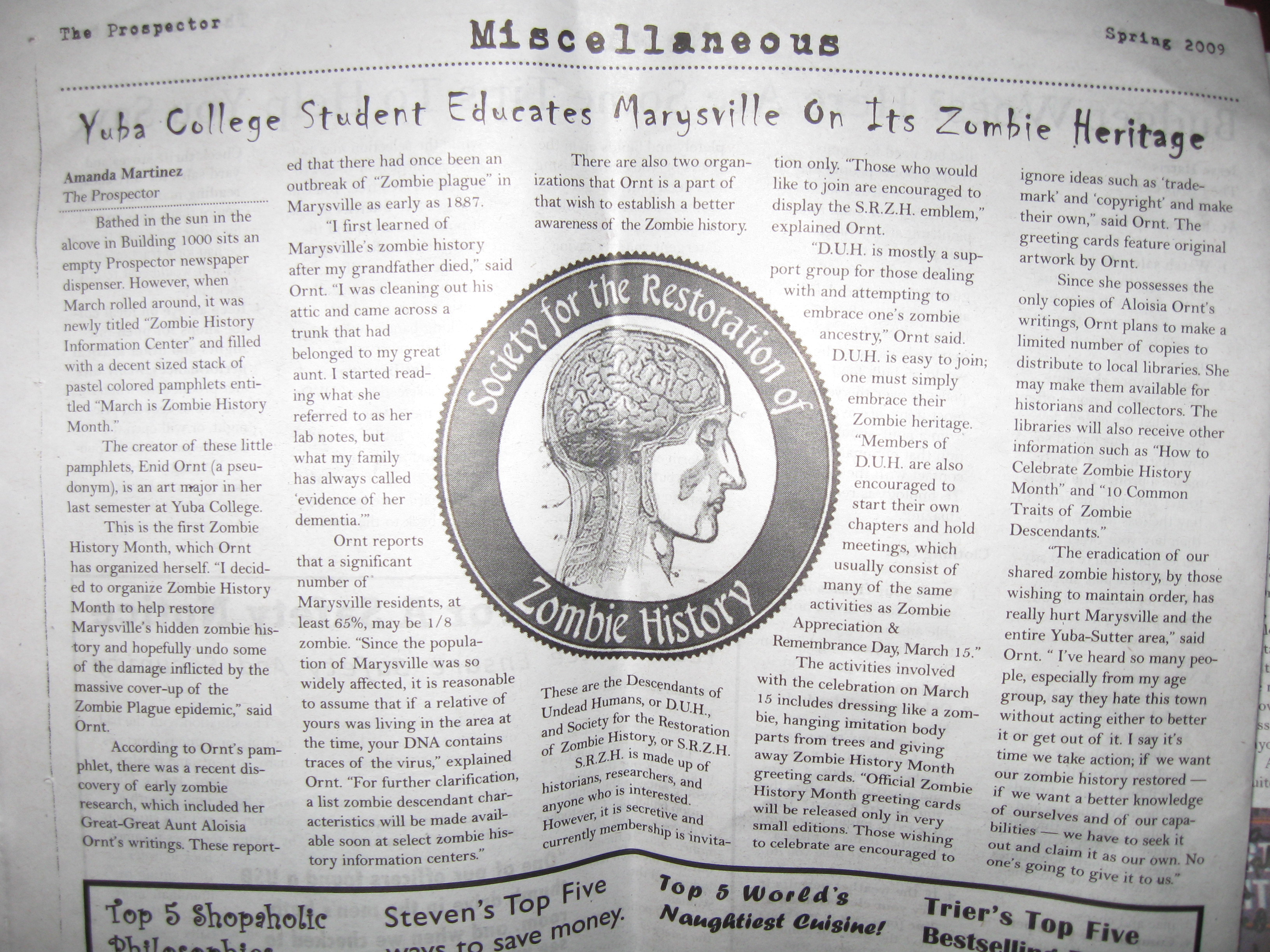 |   download file So, the best part about this is that I'm not on the newspaper staff. They don't even know who I am. After I set up the first Zombie History Information Center, someone from the staff googled Zombie History Month & found my blog (http://poisonlake.blogspot.com/) where I'd been posting ZHM updates. I did an email interview using a pseudonym. deliciously awesome & spylike. |