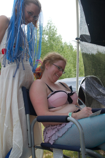 Strangers writing postcards