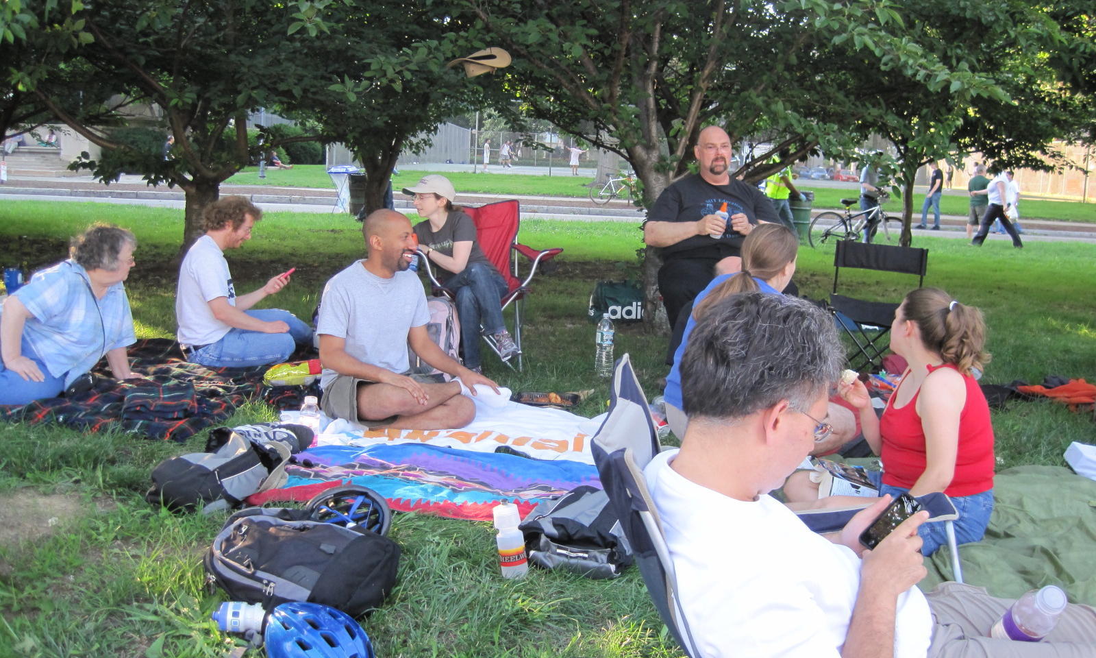 I thought dragging along folding lawn chairs was a bit overkill for a bike vacation, but some of my friends rigged up a pretty good trailer to carry the chairs.