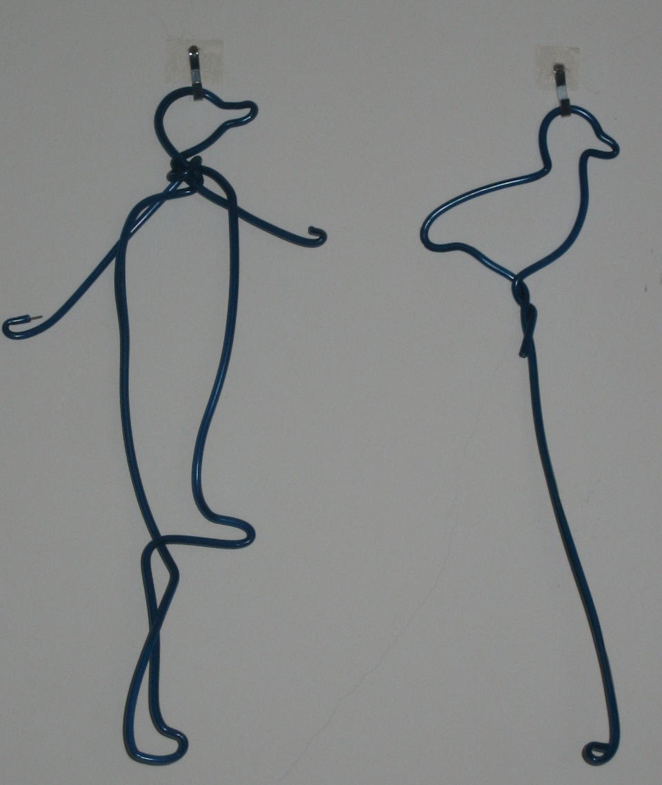 I hung these wire reproductions of the ithyphallic man and bird-on-stick in my front hallway, but couldn't decide whether they looked better by themselves, or superimposed on some other souvenirs.