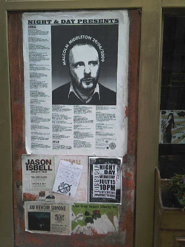 On the board outside one of my favourite nightspots and live music venues. A rather lovely barmaid took one of my flyers to check out sf0 for herself. http://www.nightnday.org/