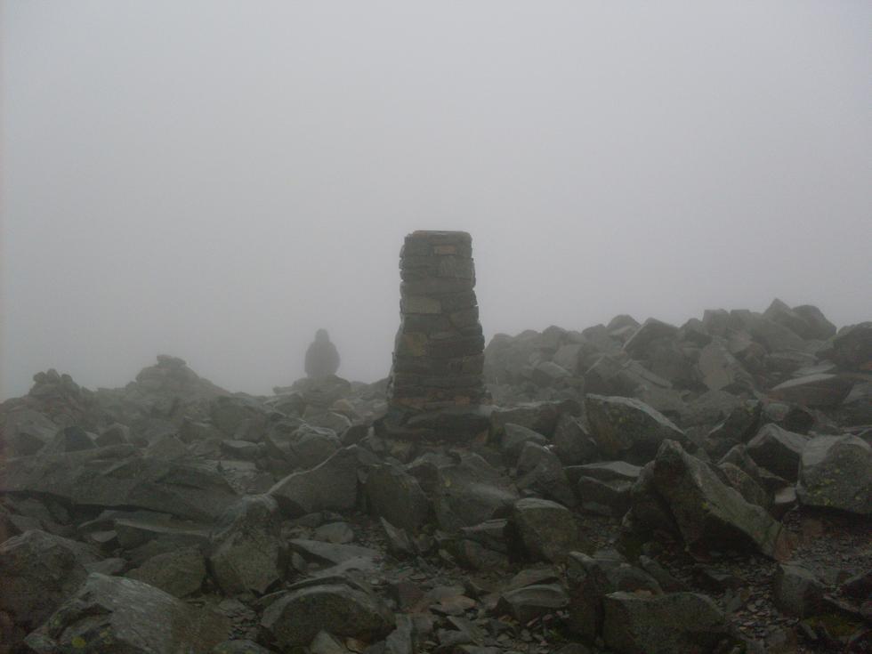Finally, after more than three hours, a trig point appeared out of the mist. We were at the top!